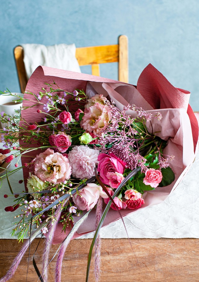 お祝いにおすすめの花束 LLサイズ ピンク系「grâce rose」 あらゆるお祝いにお使いいただけるボリュームたっぷりの花束です。 主役のお花ダリアやバラ、カーネーションに季節の実物やグリーンを使用して作りました。 濃いめのピンクを中心にグリーンとのコントラストとグラデーションで、華美になりすぎない品の良い華やかさを生み出しています。 また、長めにお作りすることでお花一輪一輪の顔が見えて、より華やかな印象にお作り致します。 軽く抱えるほどのボリュームのある花束となっておりますので、発表会や退職祝い、結婚記念日など想い出に残るお祝いの贈り物にぴったりです。