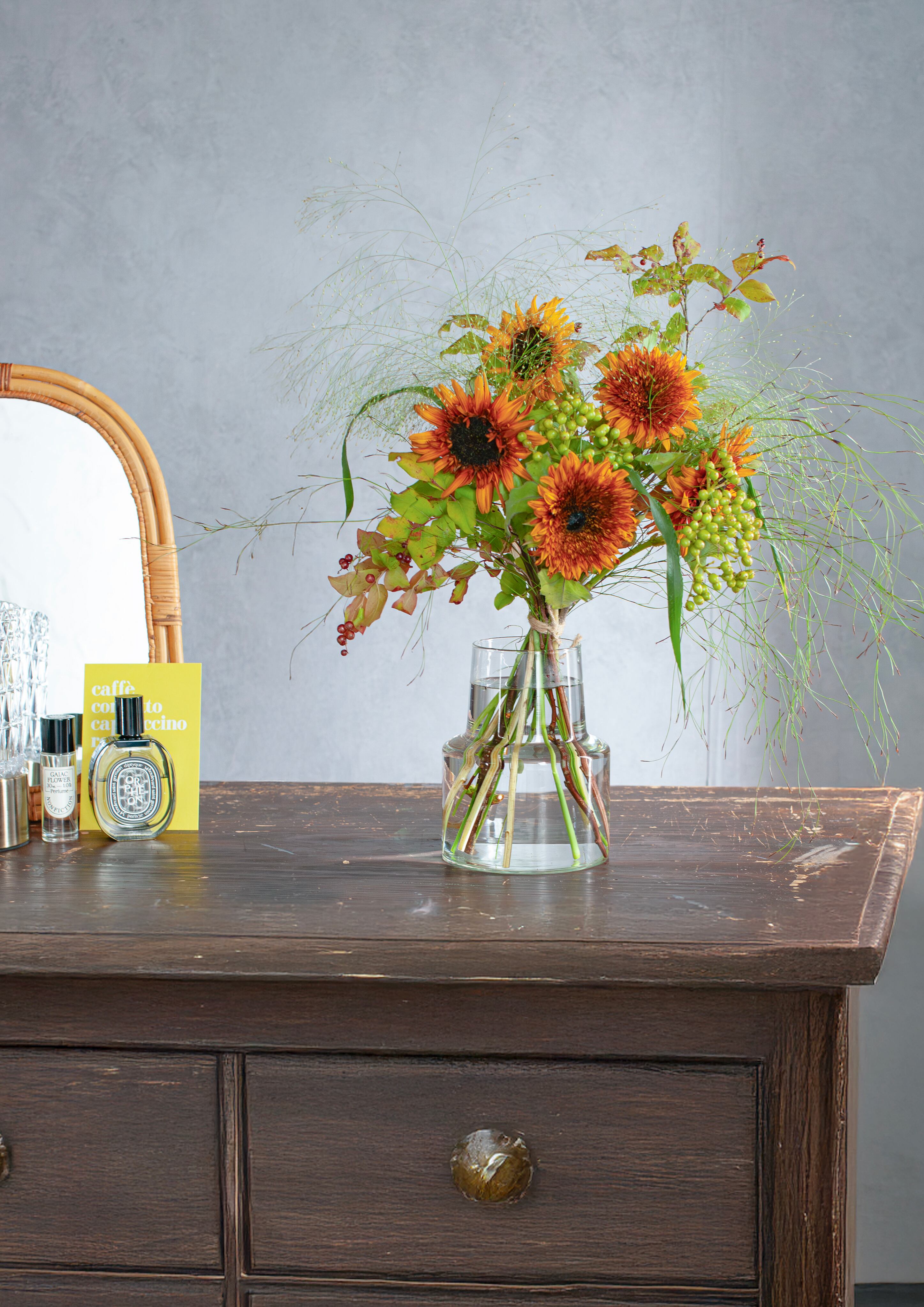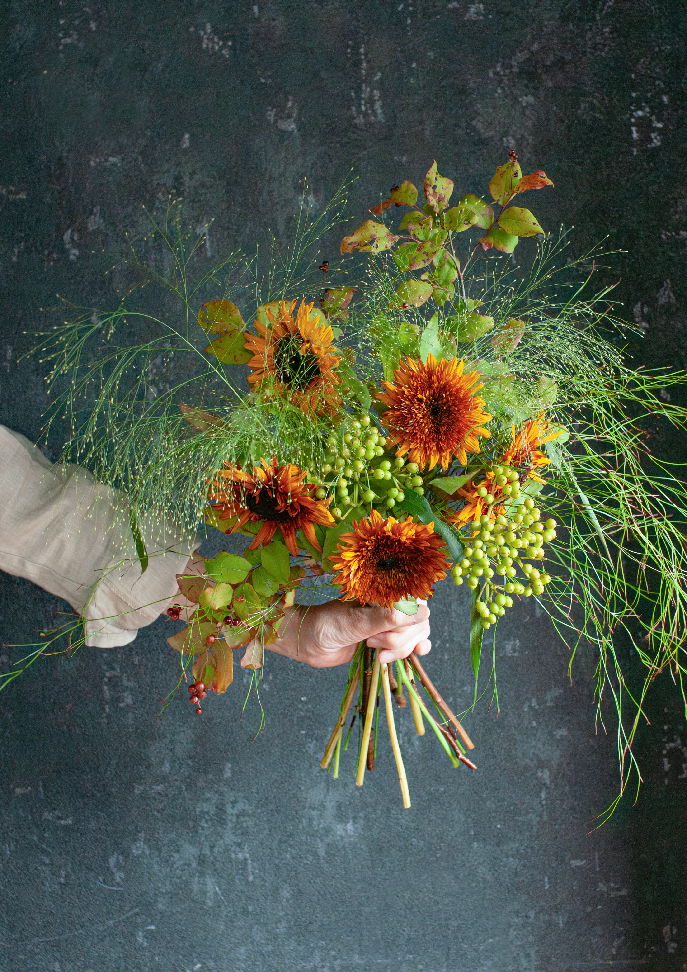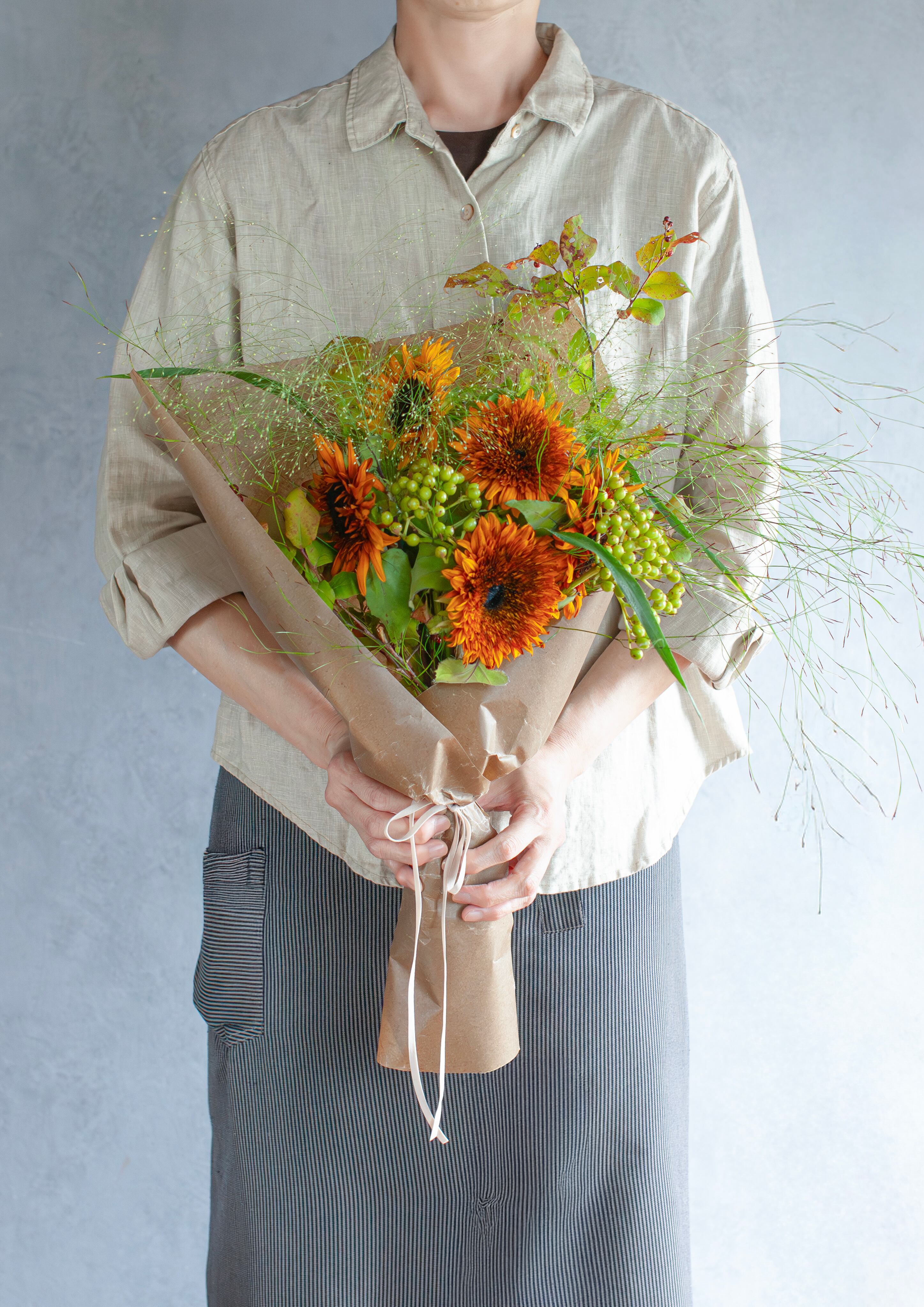 深みのあるブラウンのグラデーションのひまわり「ダージリン」と、ナチュラルで遊び心のあるグリーンを束ねて。