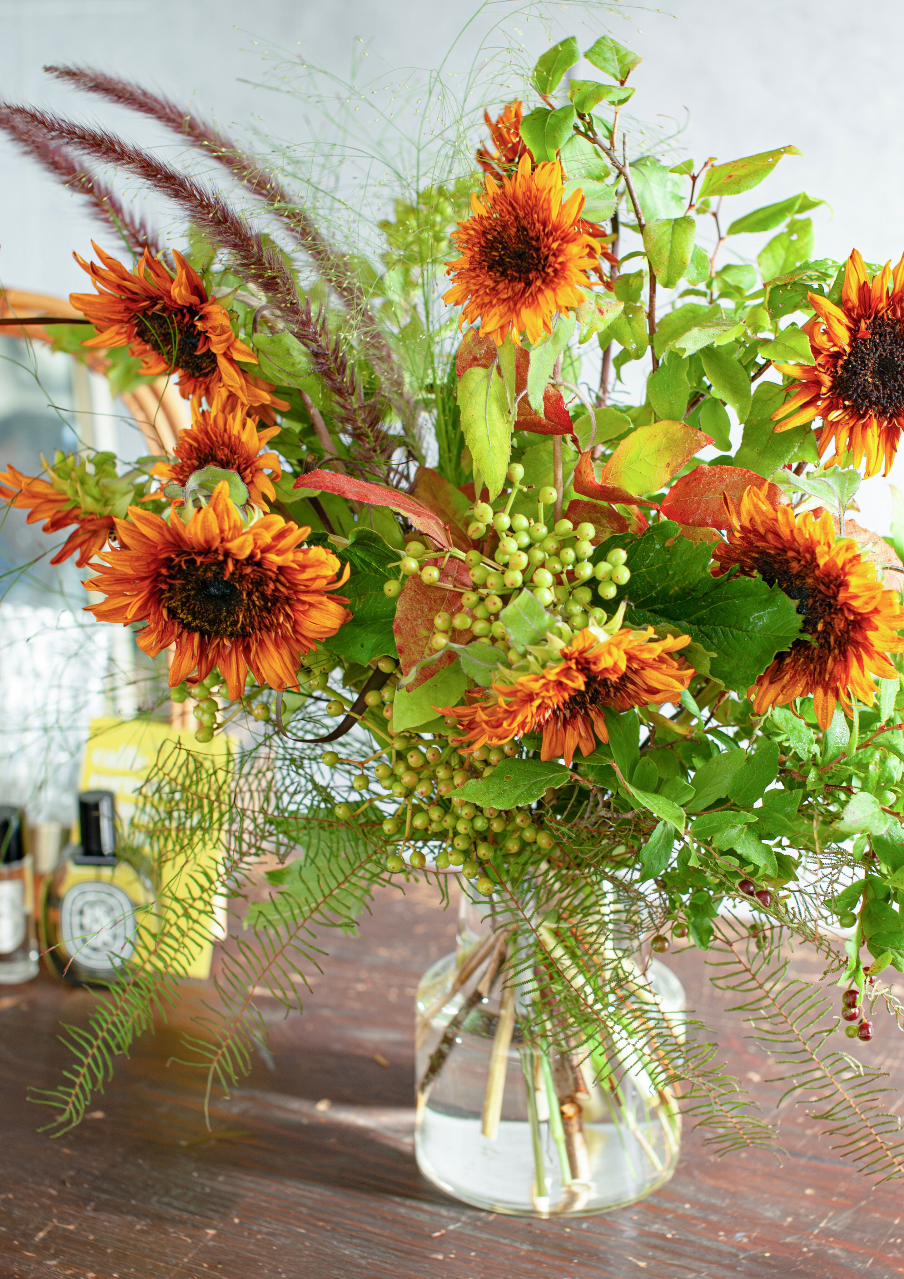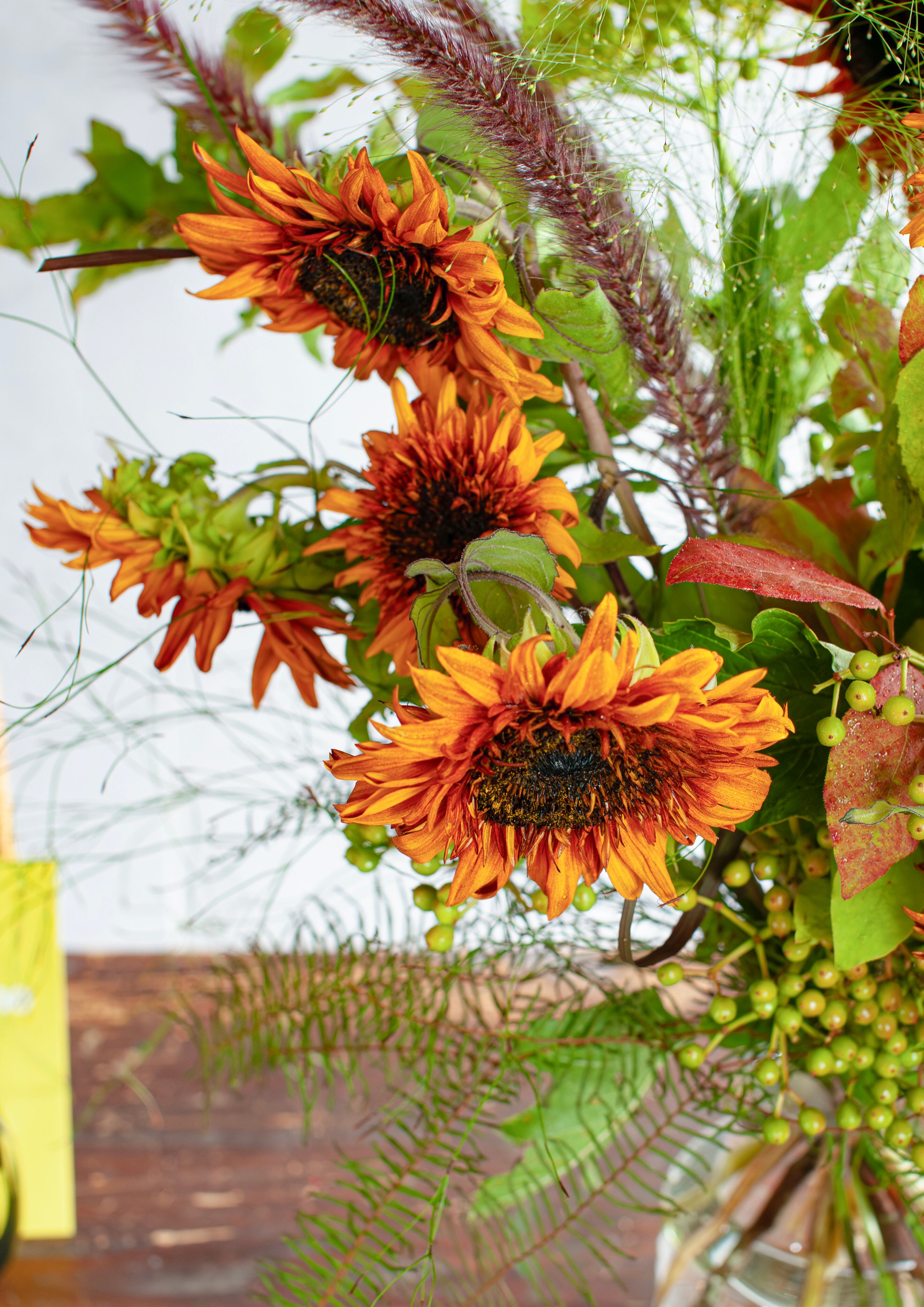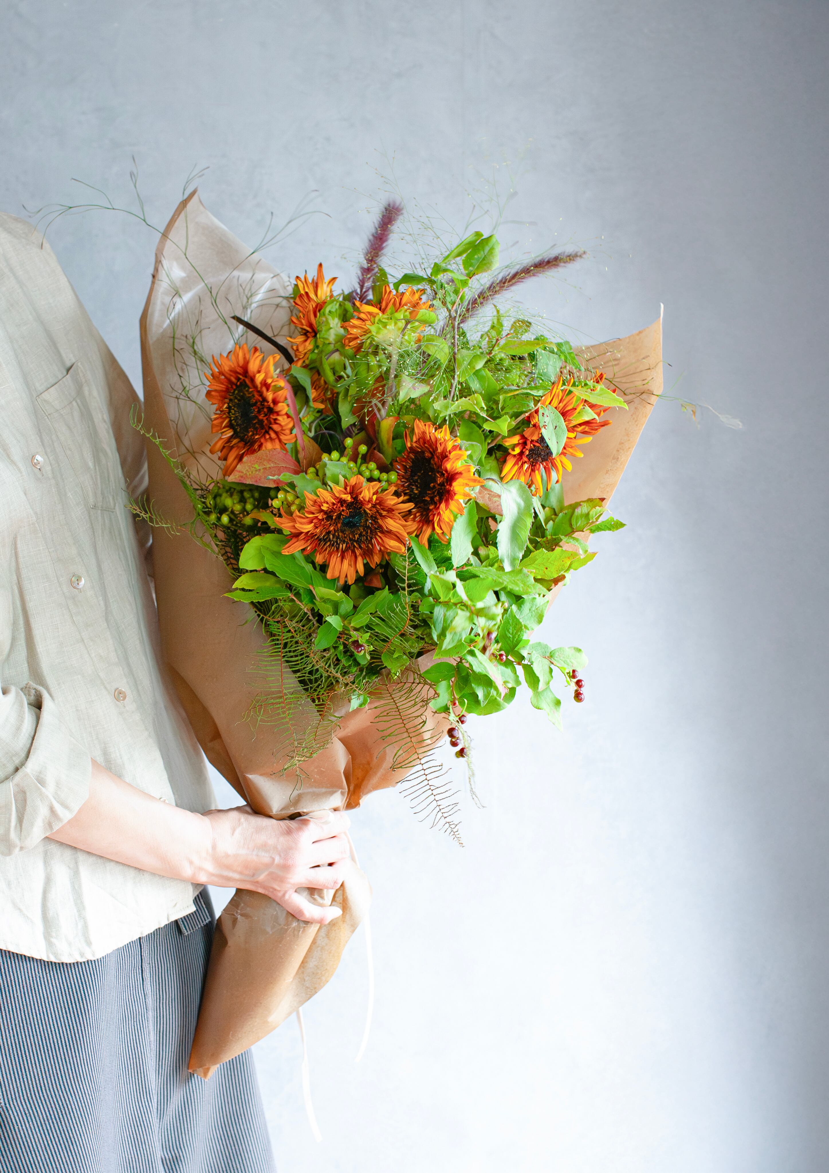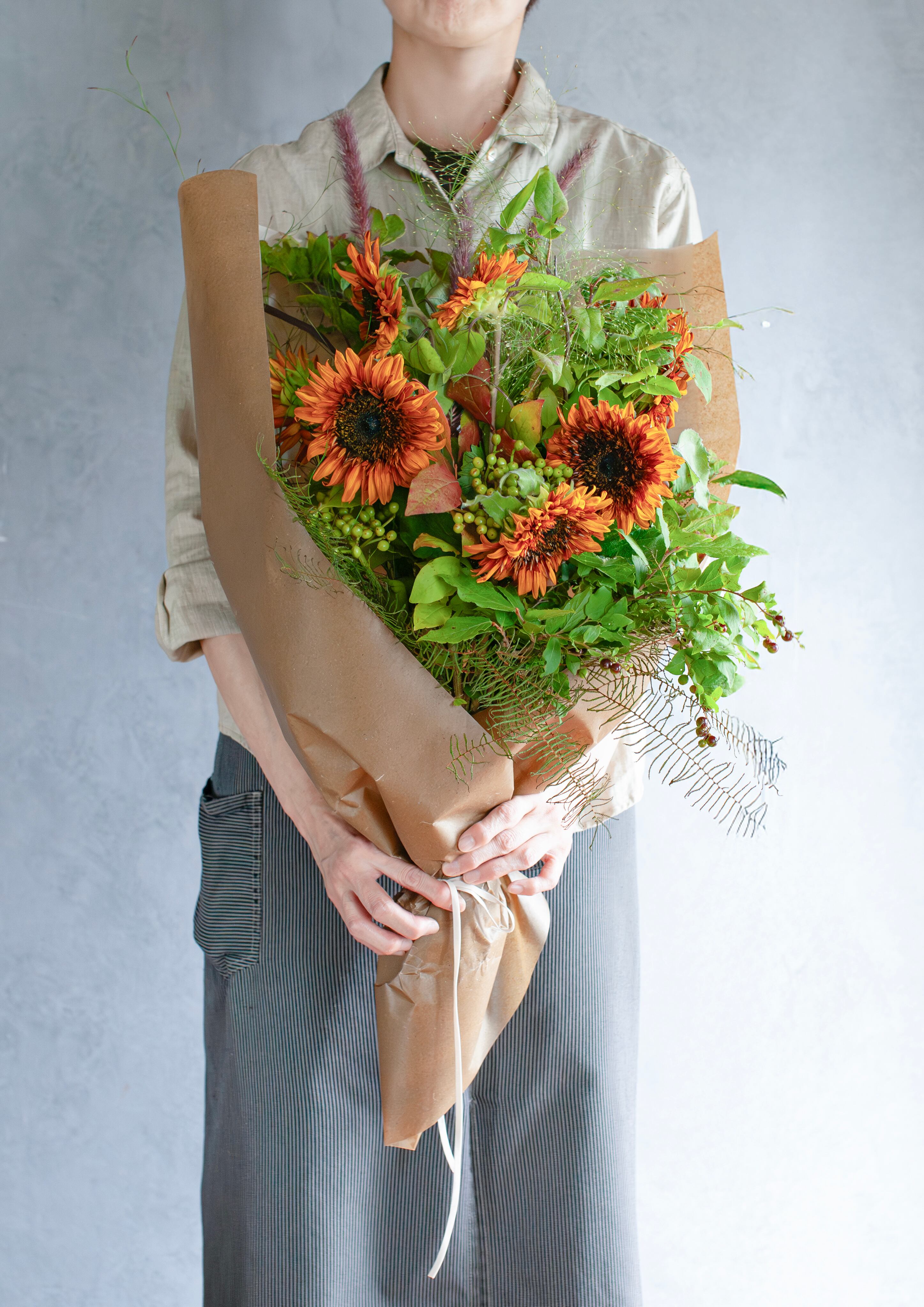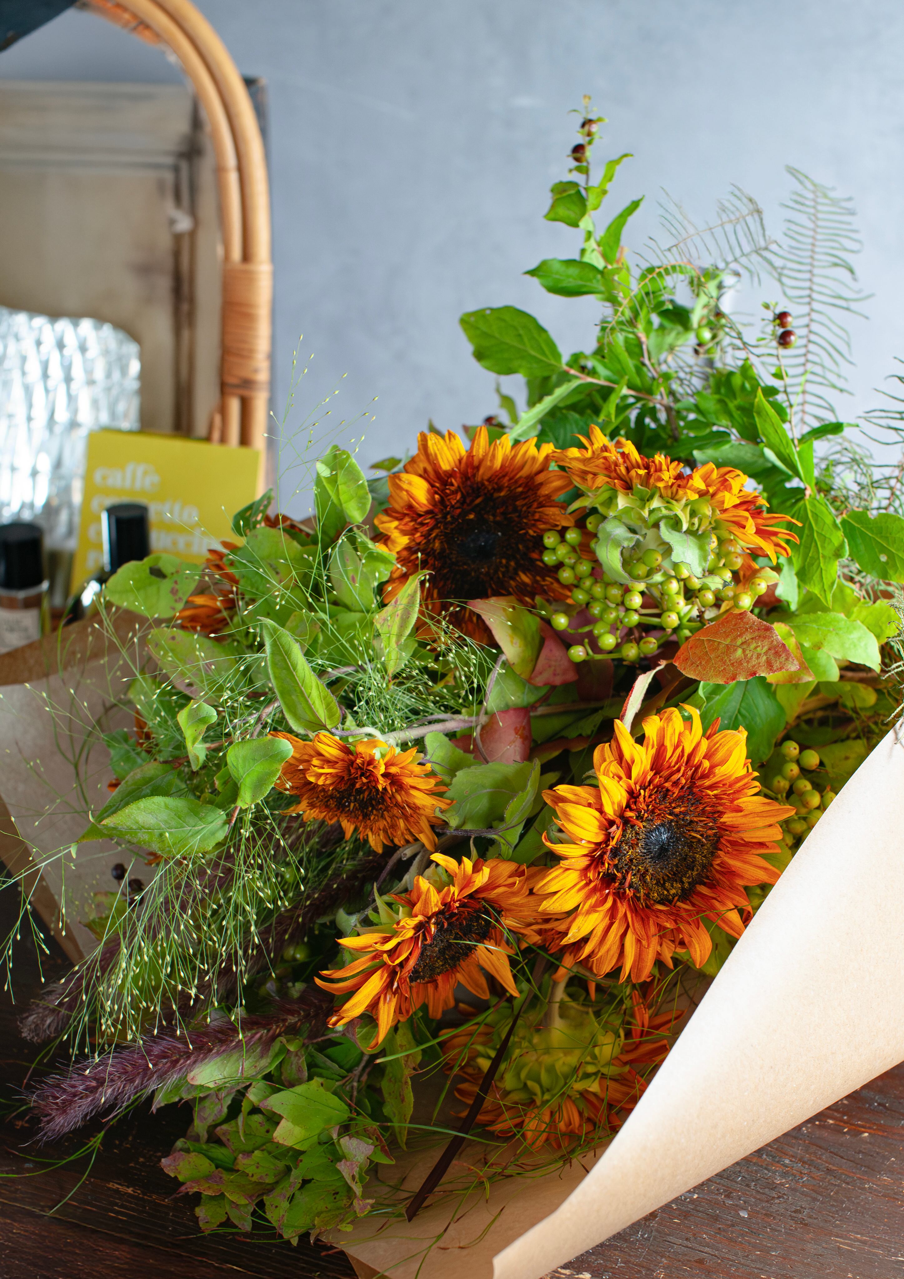 深みのあるブラウンのグラデーションのひまわり「ダージリン」と、ナチュラルで遊び心のあるグリーンをたっぷりと束ねて。