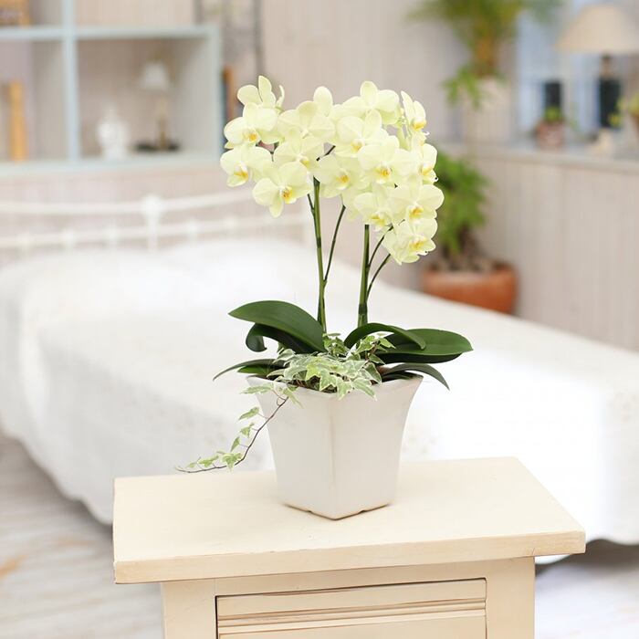 テーブルやカウンターなど、ちょっとしたスペースにも置ける可愛いサイズの胡蝶蘭「ミディ胡蝶蘭」。