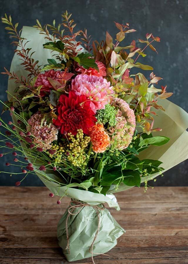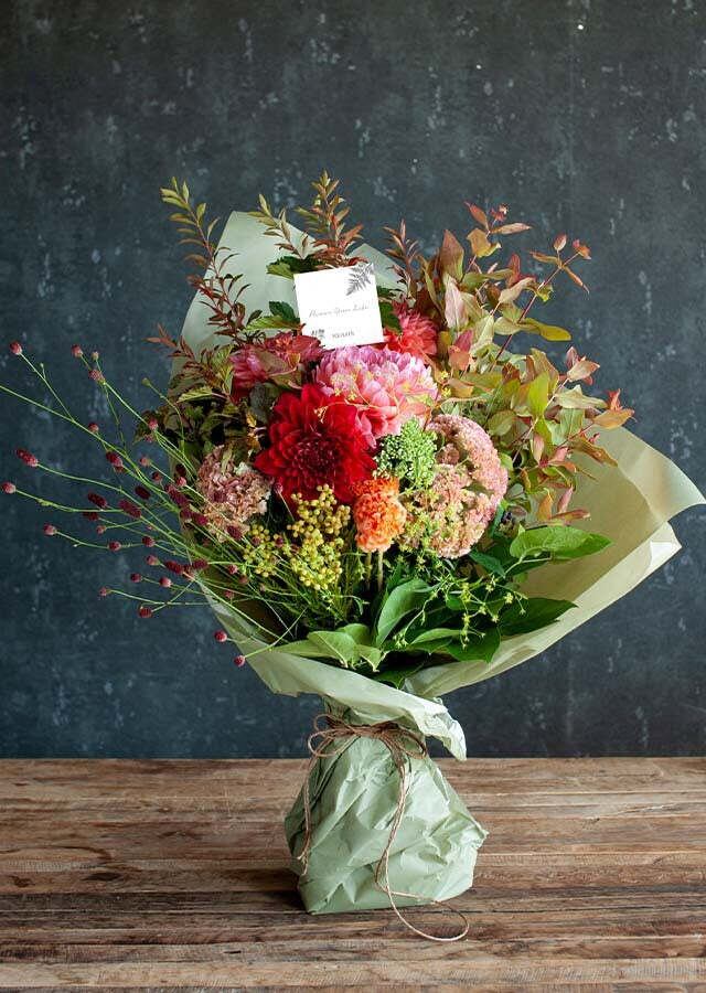旬を迎える朱やピンク、オレンジのダリアと、ケイトウや紅葉した枝物とともに、期間限定のスペシャルなブーケ(花束)をご用意しました。